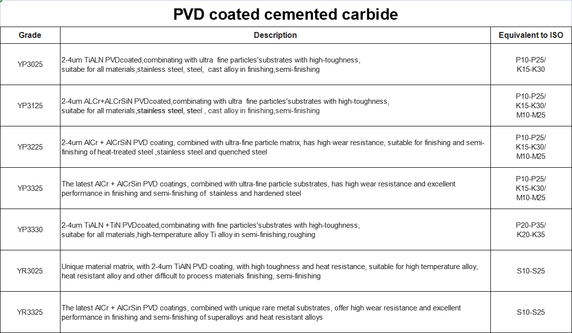| YR3025 | 獨(dú)特的材料基體,具有2-4um TiAlN PVD涂層,具有高韌性和耐熱性,適合高溫合金、耐熱合金等難加工材料的精加工、半精加工 | S10-S25 |